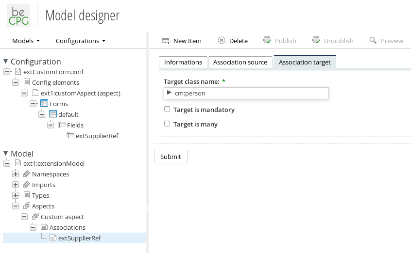 Go to designer --> Open ext model --> Add a new association to Custom Aspect of type cm:person.\ Create the corresponding form and publish your model.